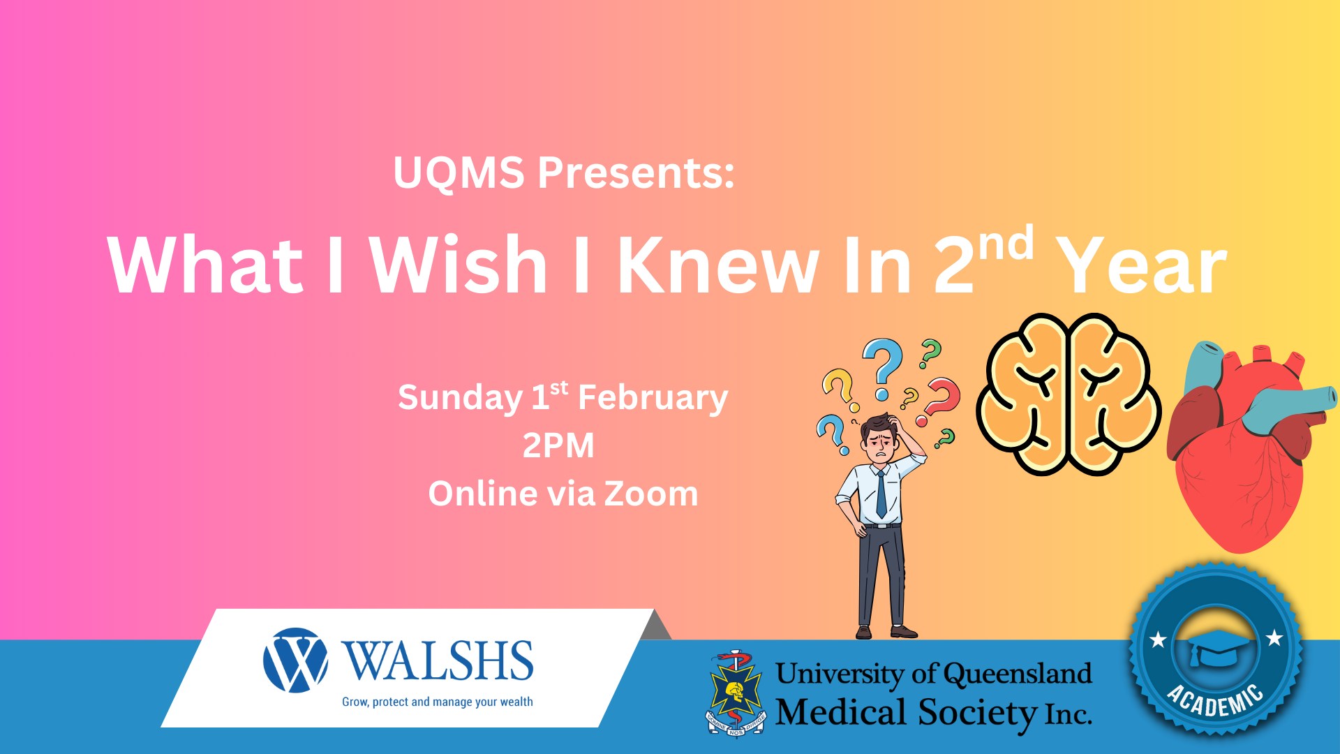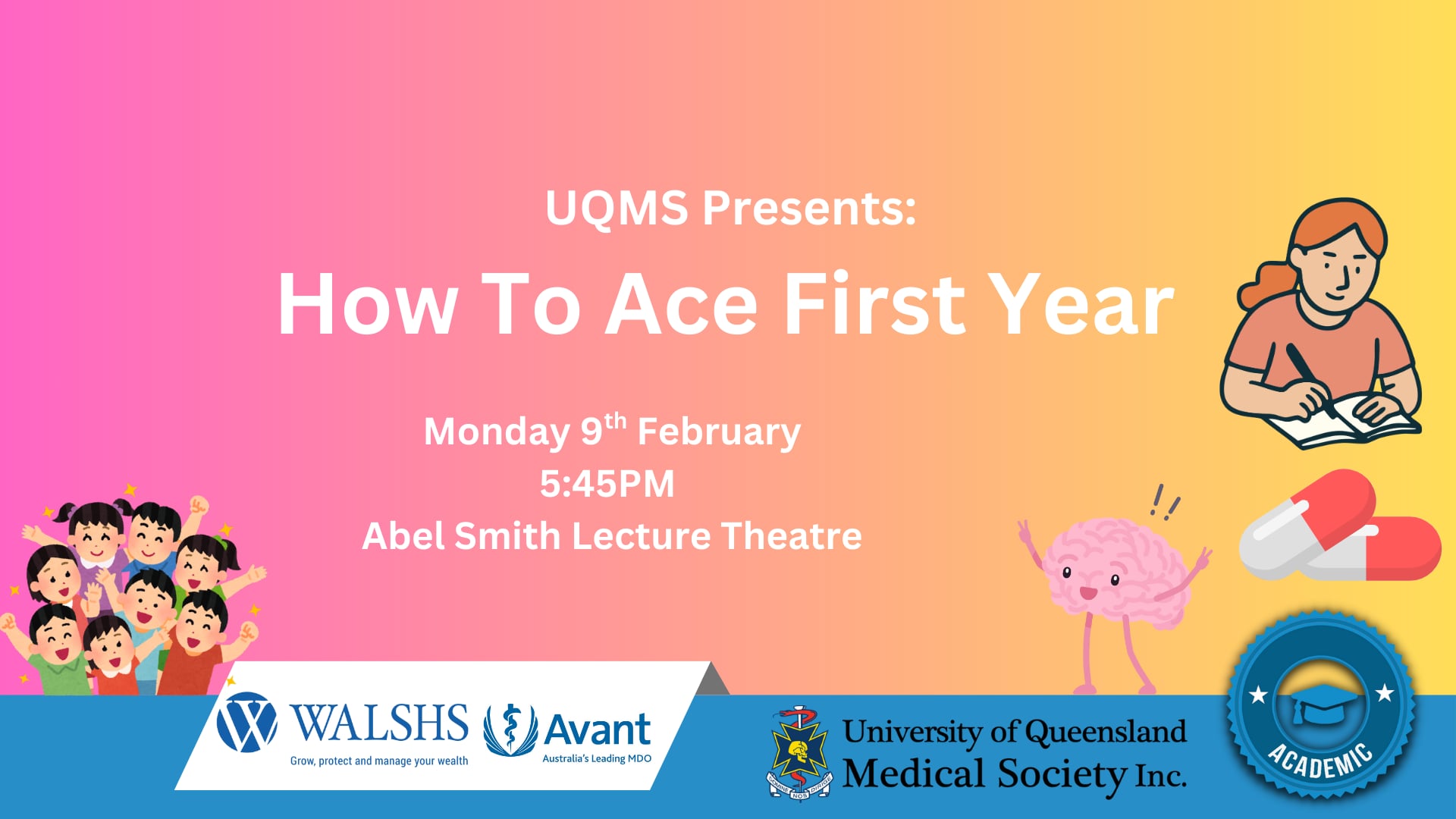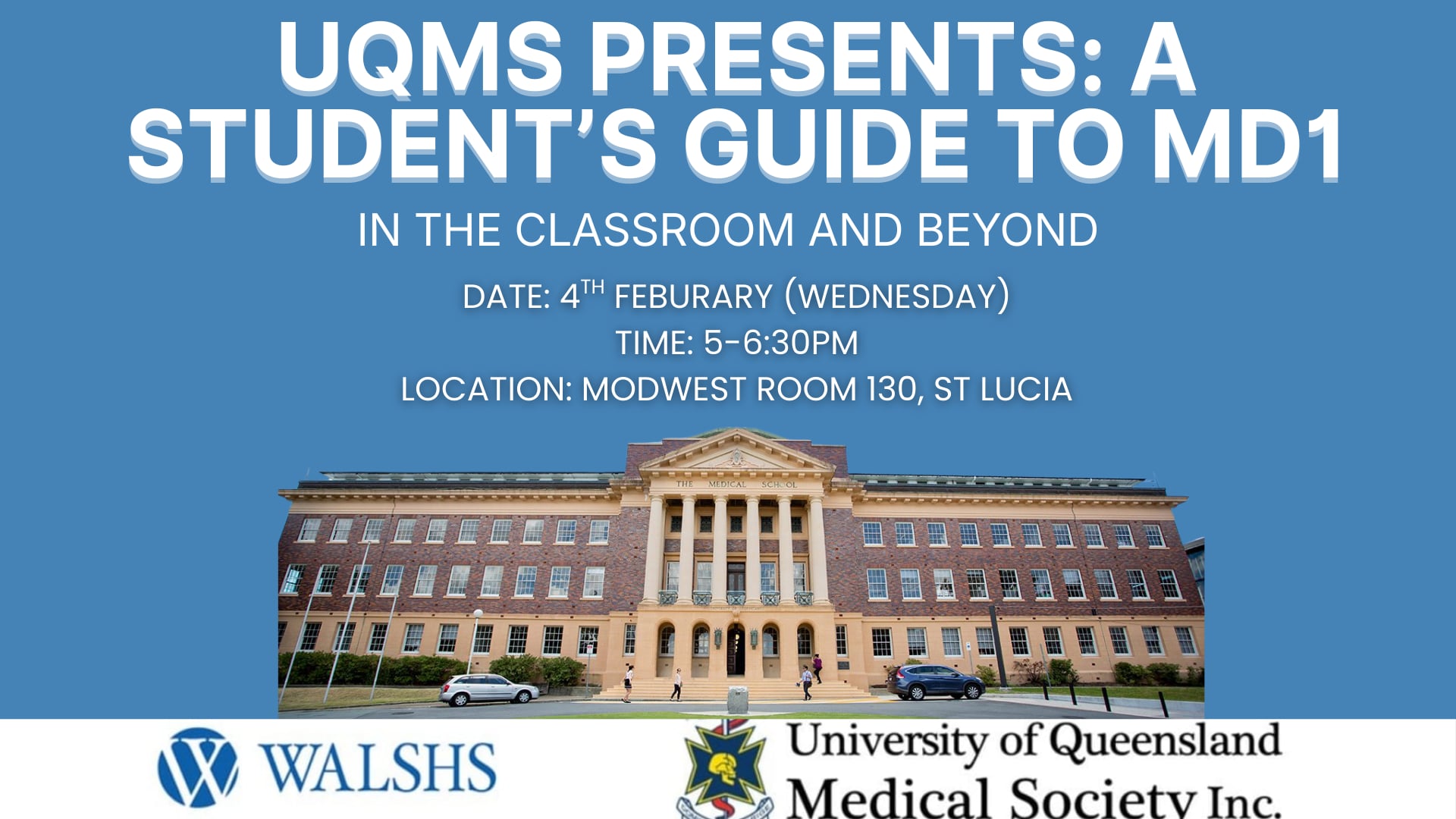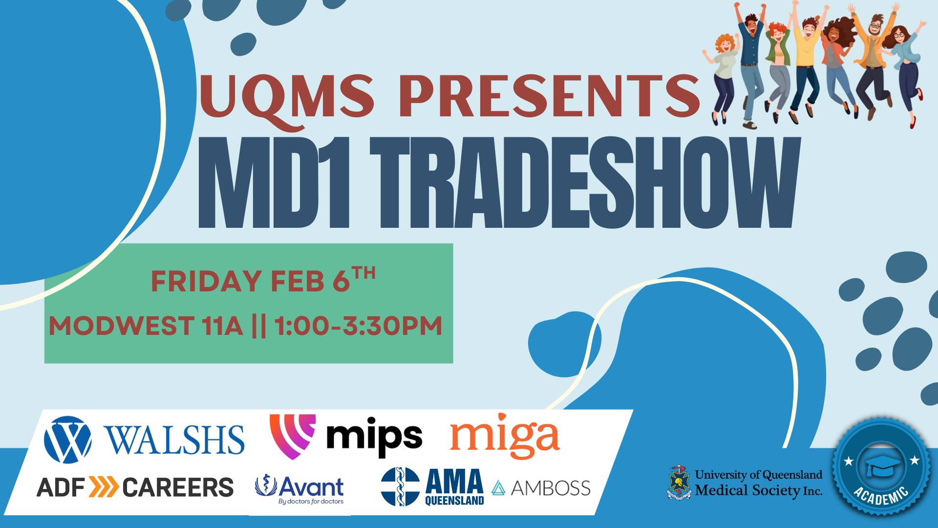 Come finish your first week of medicine at the UQMS First Year Trade Show! Come learn about (and sign up 😉 for) the plethora of medical clubs and societies at UQ. Hear more about the exciting events this year, grab some snacks and chat to our wonderful sponsors. Don’t miss out and follow our Instagram page to stay updated. We’re so excited to welcome you all to the UQ Medicine cohort!
